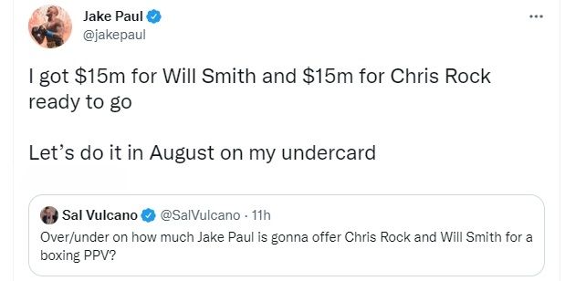 Pasó una edición más de los Premios Oscars y todavía se habla sobre el tenso cruce entre Will Smith y Chris Rock. Quien se quedó con el premio a mejor actor golpeó al presentador luego de una broma de mal gusto hacia la pareja del protagonista de Men In Black y apareció en escena Jake Paul para proponer que arreglen lo sucedido en el ring.