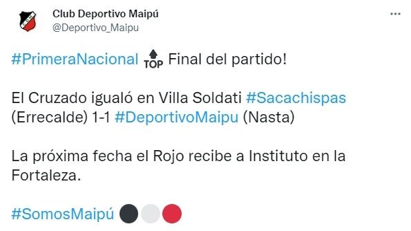 Deportivo Maipú se vuelve a Mendoza con un valioso punto. Empató en Villa Soldati con Sacachispas (1-1), mantiene el invicto y sigue dentro de los diez mejores de la Primera Nacional. El local comenzó ganando con gol de Gonzalo Errecalde en el minuto 71 de la etapa complementaria, mientras que a través de Bruno Nasta el visitante igualó el encuentro a los pocos minutos.