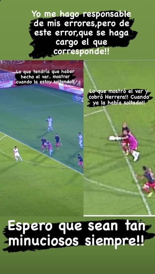 Esta mañana, Marcos Díaz publicó una captura en su cuenta de Instagram en la que explicó por qué el gol de Cóccaro debía ser convalidado y pidió que los árbitros se hagan cargo de la derrota de Huracán: “Yo me hago responsable de mis errores pero que se haga cargo el que corresponde de este error. Espero que sean tan minuciosos siempre!!”, escribió el arquero, y adjuntó capturas de lo que, para él, debía haber hecho el VAR.