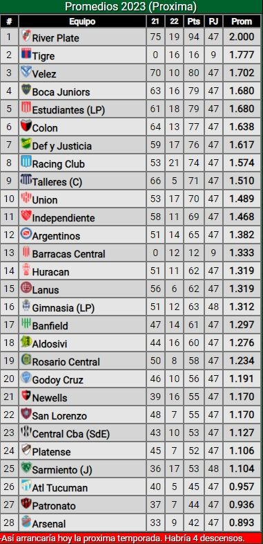 Ningún protagonista del mundo San Lorenzo había nombrado el descenso como una amenaza real. El Ciclón suma apenas siete puntos en 9 fechas de Copa de la Liga Profesional y se ubica undécimo en los promedios de 2022. Sin embargo, el problema será la temporada siguiente: sacando a Patronato y Godoy Cruz (los dos equipos que hoy estarían descendiendo), San Lorenzo arrancaría a sólo 3 puntos de la zona de descensos, que serán cuatro en 2023, y dependerá del andar de los dos equipos que asciendan para saber si estará tan apremiado como figura ahora.