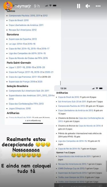 Ante ello, el delantero brasileño se pronunció a través de su cuenta oficial de Instagram con algunas publicaciones referidas al tema. En primer lugar, el exBarcelona compartió la nota bajo el título: “Sr Fabio Aurélio (con emojis de risas)”. Posteriormente, publicó una lista con todos los títulos que cosechó en su carrera, así como también su palmarés individual y añadió de forma irónica: “Realmente estoy decepcionado. Y no puse todos completos”.