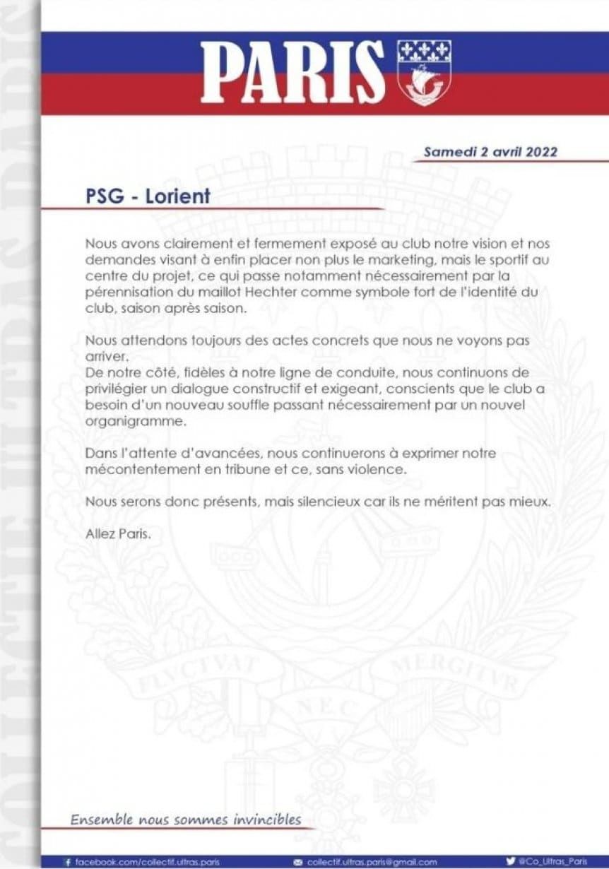 Seguimos esperando acciones concretas que no vemos venir. Por nuestra parte, fieles a nuestra línea de conducta, seguimos favoreciendo un diálogo constructivo y exigente, conscientes de que el club necesita un nuevo respiro que pase necesariamente por un nuevo organigrama. A la espera de avances, seguiremos expresando nuestro descontento en las tribunas sin violencia. Estaremos presentes, pero en silencio porque no se merecen nada mejor. Vamos Paris!"