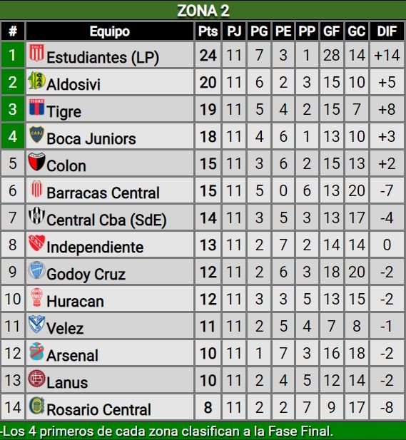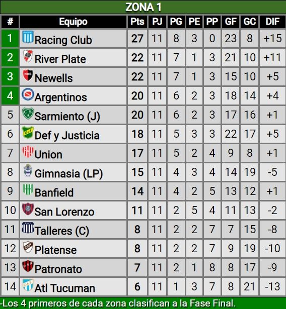 Si el torneo hubiese terminado con los últimos partidos de este jueves, los cruces serías: Racing-Boca, River-Tigre, Estudiantes-Argentinos y Aldosivi-Newell's. La fecha 12 del certamen nacional pondrá primera este viernes con el partido entre Colón de Santa Fe y el Pincha, en cancha del Sabalero, desde las 20.30.