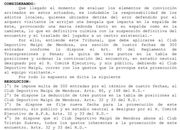 En el marco de la séptima fecha de la Primera Nacional, el pasado miércoles 23 de marzo, Deportivo Maipú derrotaba 1 a 0 a Tristán Suárez con gol de Bruno Nasta en el estadio Omar Sperdutti, cuando a pocos minutos de concluir el primer tiempo el partido debió ser suspendido por una repudiable agresión a un jugador visitante.
