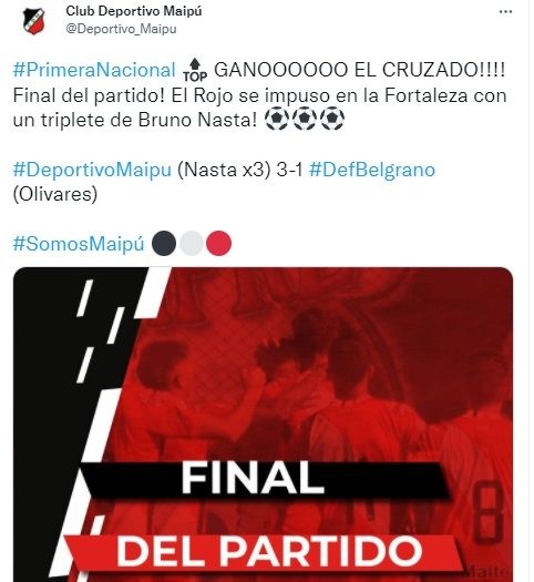 Deportivo Maipú venció 3 a 1 a Defensores de Belgrano en el estadio Omar Higinio Sperdutti por la novena fecha de la Primera Nacional. Bruno Nasta fue la gran figura de la tarde al marcar los tres tantos del Cruzado. El partido arrancó con mucha dinámica de ambos equipos. La visita intentó presionar bien arriba en la salida del local y trató de llegar con prolijidad.