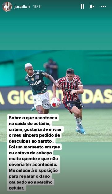 "Sobre lo que ocurrió a la salida del Allianz Parque, me gustaría mandar mi más sincero pedido de disculpas a ese muchacho", escribió Calleri en un mensaje publicado en su cuenta de Instagram.