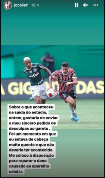 El lunes último Calleri publicó una disculpa en su cuenta de la red social Instagram y dijo que estaba dispuesto a asumir los costos de reparación del dispositivo, señaló Globo Esporte.