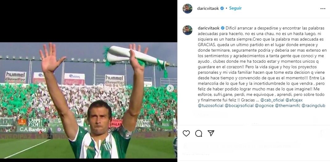 En la publicación, que acompañó con fotos de los clubes donde jugó, agregó: "No es un chau, no es un hasta luego, ni siquiera es un hasta siempre. Creo que la palabra más adecuada es gracias. Queda un último partido en el lugar donde empecé y donde terminaré. Seguramente podría y debería ser más extenso en los sentimientos y agradecimientos a tanta gente que conocí y me ayudó, clubes donde me ha tocado estar y momentos únicos que guardaré en mi corazón".