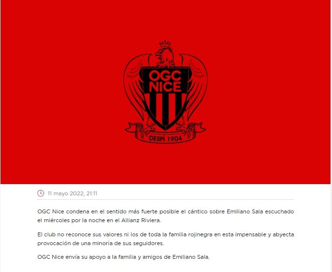 En el comunicado repudiando el hecho, el club francés expresó: "El Niza condena en los términos más enérgicos la canción sobre Emiliano Sala escuchada el Allianz Riviera. El club no reconoce sus valores ni los de toda la familia rojinegro en esta impensable y abyecta provocación de una minoría de sus seguidores. Niza envía su apoyo a la familia y seres queridos de Sala".