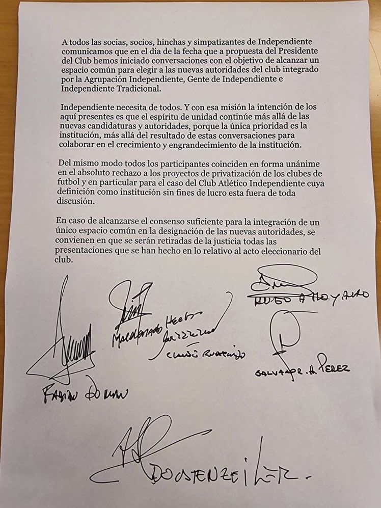 "A todos las socias, socios, hinchas y simpatizantes de Independiente comunicamos que en el día de la fecha que a propuesta del Presidente del Club hemos iniciado conversaciones con el objetivo de alcanzar un espacio común para elegir las nuevas autoridades del club integrado por la Agrupación Independiente, Gente de Independiente e Independiente Tradicional.