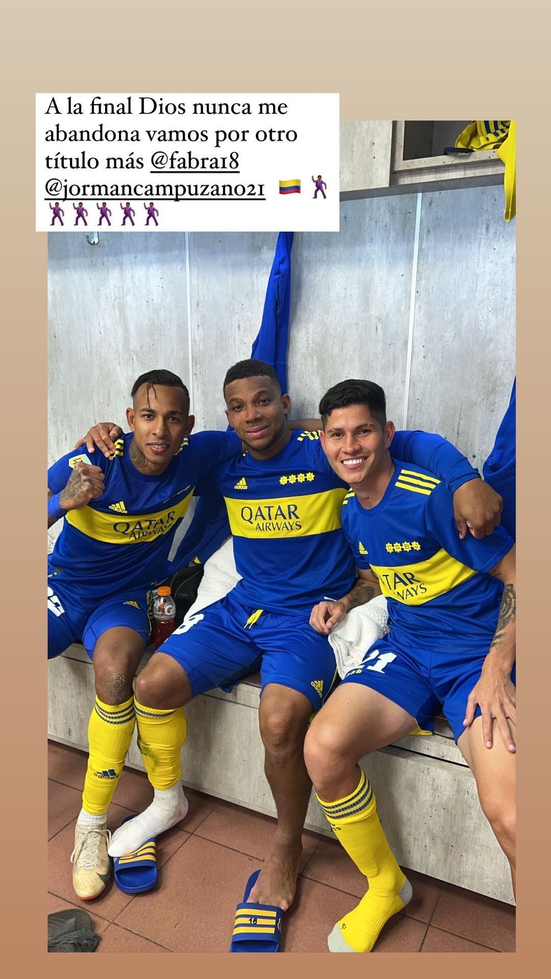 Una vez en el vestuario y tras los cantos del plantel que se viralizaron en los canales oficiales de la institución, Sebastián Villa irrumpió en las redes sociales. A través de su cuenta de Instagram el colombiano se mostró junto a sus compatriotas Frank Fabra y Jorman Campuzano.