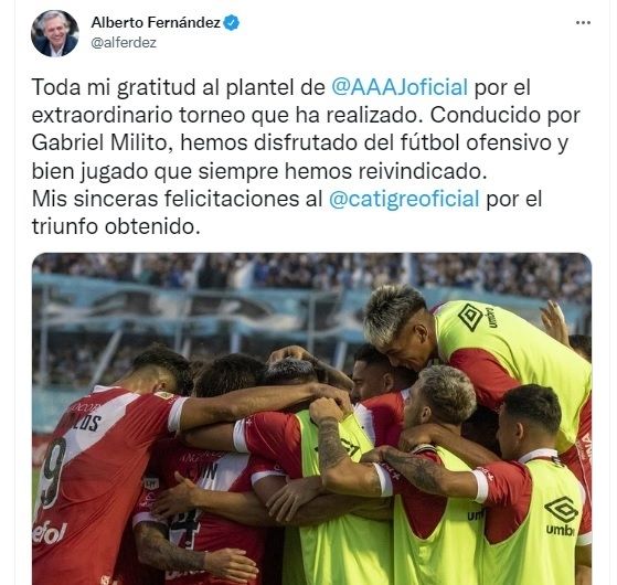 "Toda mi gratitud al plantel de Argentinos Juniors por el extraordinario torneo que ha realizado. Conducido por Gabriel Milito, hemos disfrutado del fútbol ofensivo y bien jugado que siempre hemos reivindicado", escribió Alberto Fernández en su cuenta de Twitter. Y agregó: "Mis sinceras felicitaciones al Club Atlético Tigre por el triunfo obtenido".