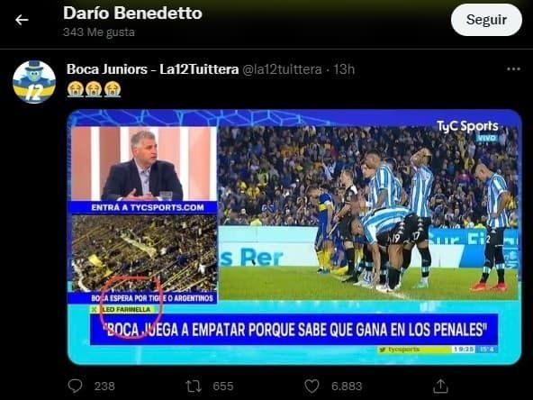 Uno de los que salió a responder, con mucha altura, fue Darío Benedetto. El Pipa le dio like a tres tweets: uno sobre el periodista de TyC Sports, que compartió la cuenta @la12tuittera, otro a un video del Lolo Miranda declarando luego del encuentro y una sobre el Diario Olé que remarcaba que llegó a la final sin patear al arco.