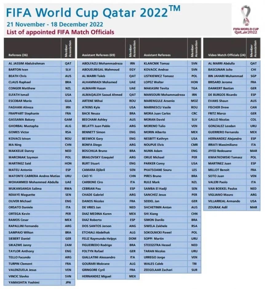 Para Qatar 2022 fueron escogidos 36 árbitros, 69 asistentes y 24 miembros del equipo VAR tras un proceso de selección iniciado en 2019, atravesado por la falta de actividad en 2020 debido a la pandemia de coronavirus. Los referís elegidos participarán en junio y julio de distintos seminarios a dictarse en Asunción (Paraguay), Madrid (España) y Doha (Qatar), en los que se revisarán y analizarán videos de situaciones reales de partido, y desarrollarán sesiones prácticas de entrenamiento con futbolistas.