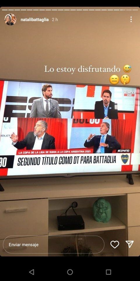 Pero Sebastián no fue el único Battaglia que dejó un mensaje para los que lo veían afuera de Boca. Natalí, su hermana, también dijo lo suyo. Fue a través de sus historias en Instagram, donde posteó una foto mirando ESPN F90, el programa de los mediodías del Pollo Vignolo. Y mientras el videograph en la TV decía "Segundo título como DT para Battaglia", Natalí chicaneó: "Lo estoy disfrutando". A ese mensaje le agregó tres emojis: uno de risa nerviosa, otro de mirada desconfiada y un último pidiendo silencio.