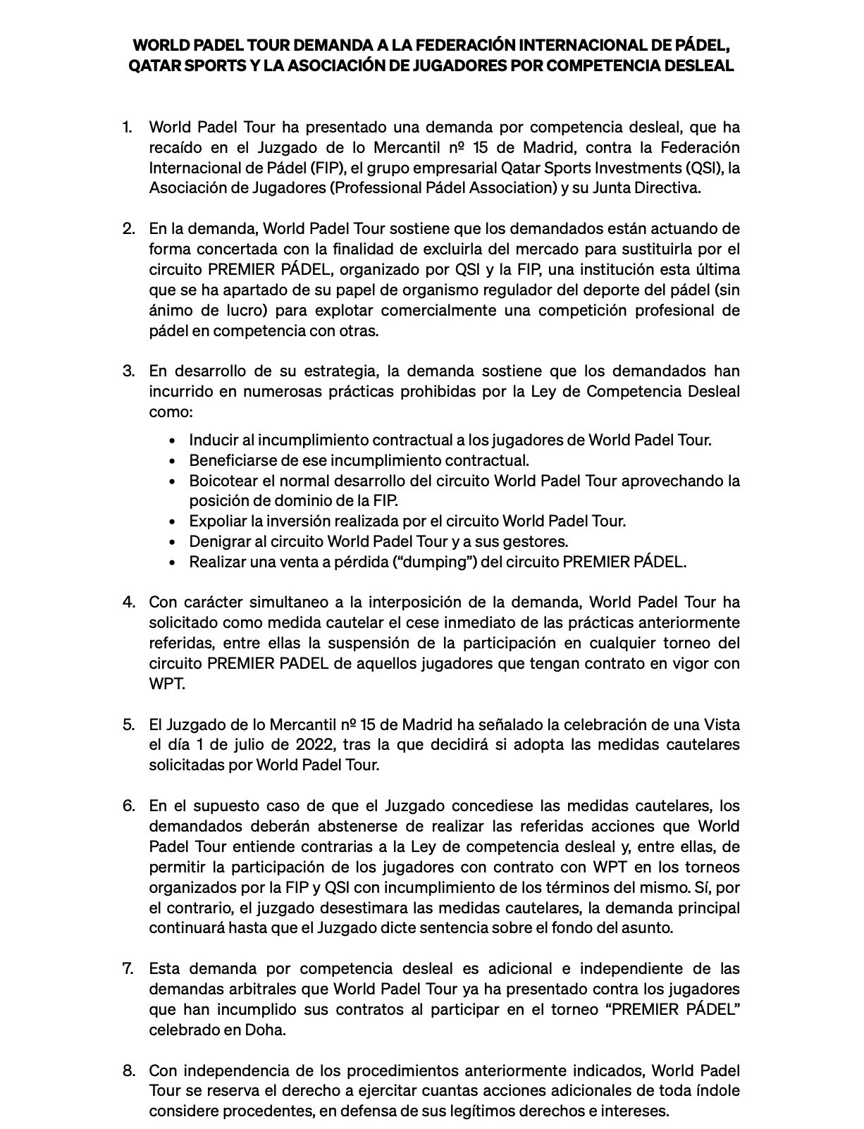 A través de un duro comunicado, explicaron que la demanda fue por "competencia desleal". "Los demandados están actuando de forma concertada con la finalidad de excluirla (a la empresa del WPT) del mercado para sustituirla por el circuito Premier Pádel, organizado por QSI y la FIP", aseguran.