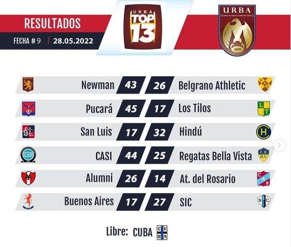 Próxima fecha (décima, sábado 4 de junio): SIC-Alumni, Atlético del Rosario-CASI, Regatas de Bella Vista- San Luis, Hindú-Pucará, Los Tilos-Newman y Belgrano-CUBA. Libre: Buenos Aires.