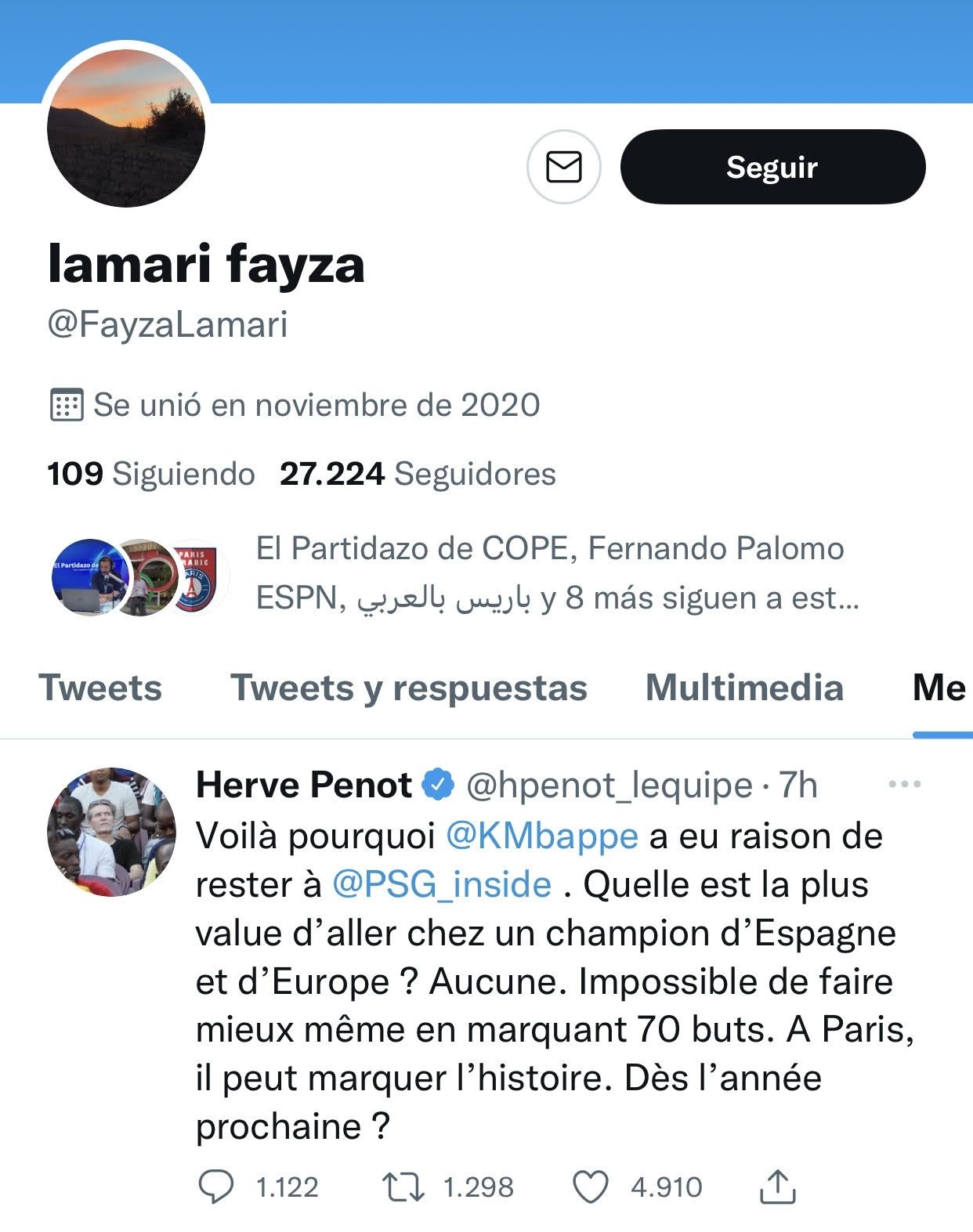 En esta ocasión un me gusta que se viralizó fue el de su madre. La cuenta de Twitter de Fayza Lamari decidió darle like a un posteo realizado por Herve Penot. El periodista del diario L'Equipe publcó un análisis personal sobre la decisión que tomó el delantero francés de no darle el sí final al Merengue.