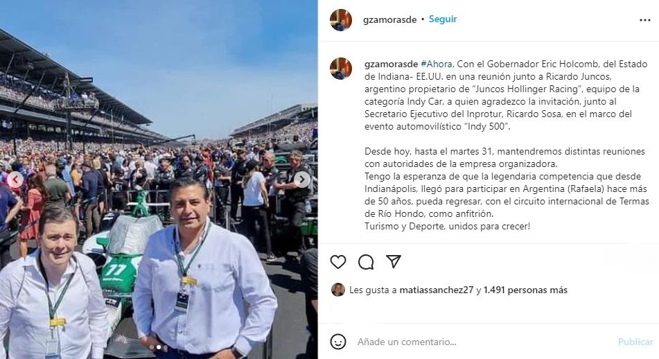 En sus redes sociales, el mandatario escribió: "Desde hoy (por ayer), hasta el martes 31, mantendremos distintas reuniones con autoridades de la empresa organizadora. Tengo la esperanza de que la legendaria competencia que desde Indianápolis, llegó para participar en Argentina (Rafaela) hace más de 50 años, pueda regresar, con el circuito internacional de Termas de Río Hondo, como anfitrión. Turismo y Deporte, unidos para crecer".