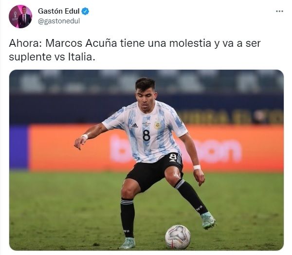 A menos de 24 horas para la Finalissima entre la Selección argentina e Italia, se conoció que Marcos Acuña no será de la partida por una molestia que arrastraba en los entrenamientos y en su lugar estará Nicolás Tagliafico. El Huevo, de igual manera, se entrenó a la par de de sus compañeros y estará en el banco de suplentes en Wembley.