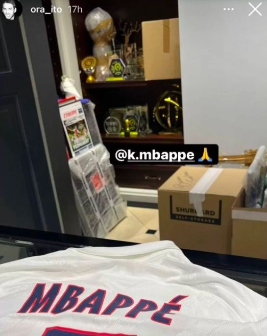 El artista Ora Ito, amigo de Kylian Mbappé, subió a sus historias de Instagram unas imágenes en casa de la estrella del PSG en las que se puede vislumbrar que el jugador está preparando una mudanza. En una de estas imágenes, el artista da las gracias al futbolista por el regalo de una camiseta firmada y se ve de fondo una estantería con trofeos empacados, además de cajas de cartón con portadas sobre Mbappé y otras ya cerradas.