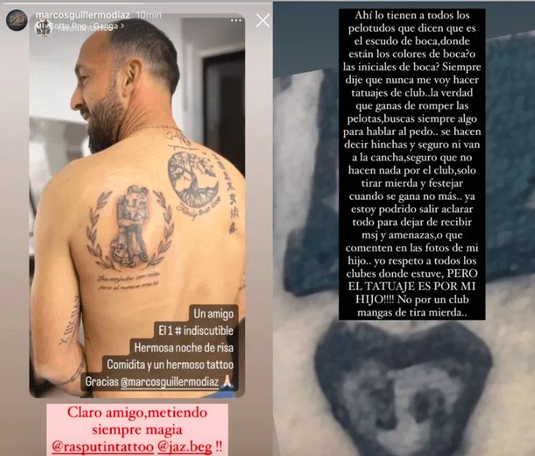 "Ahí los tienen a todos los pelotudos que dicen que es el escudo de Boca. ¿Dónde están los colores de Boca? ¿O las iniciales de Boca? Siempre dije que nunca me voy a hacer tatuajes de club. La verdad, qué ganas de romper las pelotas. Buscan siempre algo para hablar al pedo", expresó Marcos Díaz.