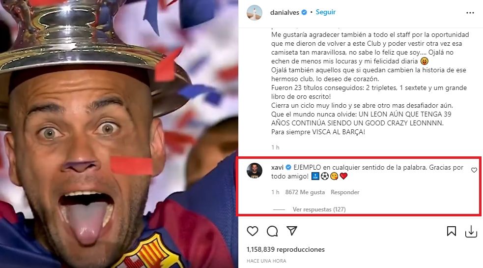 En menos de una hora, el video publicado superó el millón de reproducciones y los 17 mil comentarios. Uno de los primeros, y quizás de los menos esperados, fue el que escribió Xavi Hernández. "EJEMPLO en cualquier sentido de la palabra. Gracias por todo amigo", escribió el DT del Culé, quien rápidamente fue criticado por los usuarios, que defendieron a Dani Alves y le objetaron la decisión tomada.