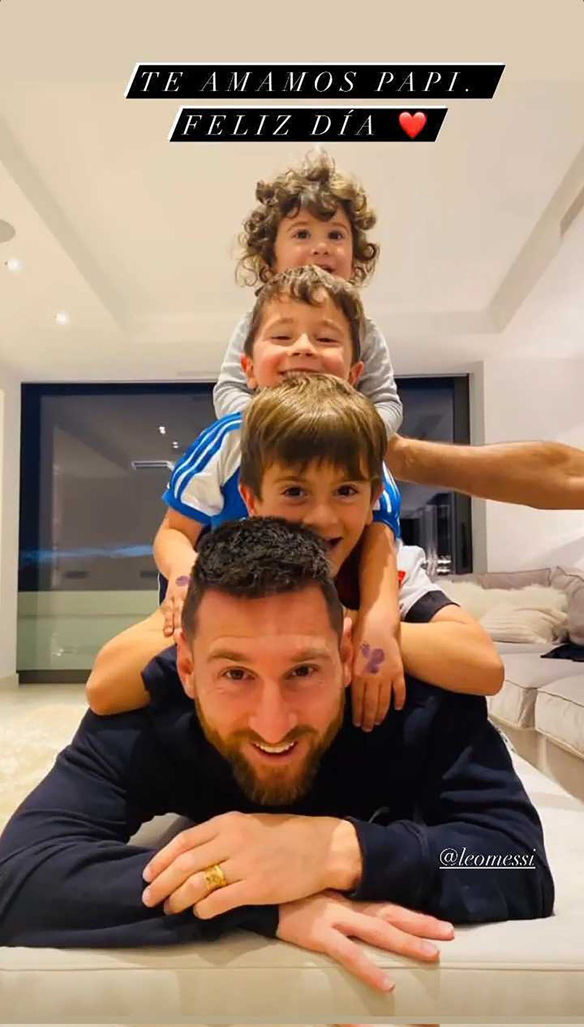 No fue un posteo con un texto largo sino una historia de Instagram: Antonela, el amor de toda la vida del astro del fútbol mundial, subió una foto en la que aparece Messi en el piso junto a sus tres hijos en una piscina. Papá Leo tiene al pequeño Ciro sobre sus hombros, mientras que Mateo y Thiago flotan a sus costados: "Felíz día del padre, te amamos infinito", escribió Rocuzzo.