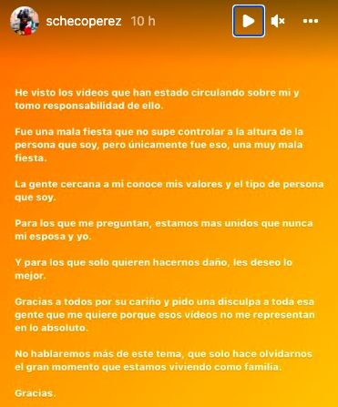 “Para los que preguntan, estamos más unidos que nunca mi esposa y yo. Y para los que solo quieren hacernos daño, les deseo lo mejor. Gracias a todos por su cariño y pido una disculpa a toda esa gente que me quiere porque esos videos no me representan en lo absoluto”, añadió.