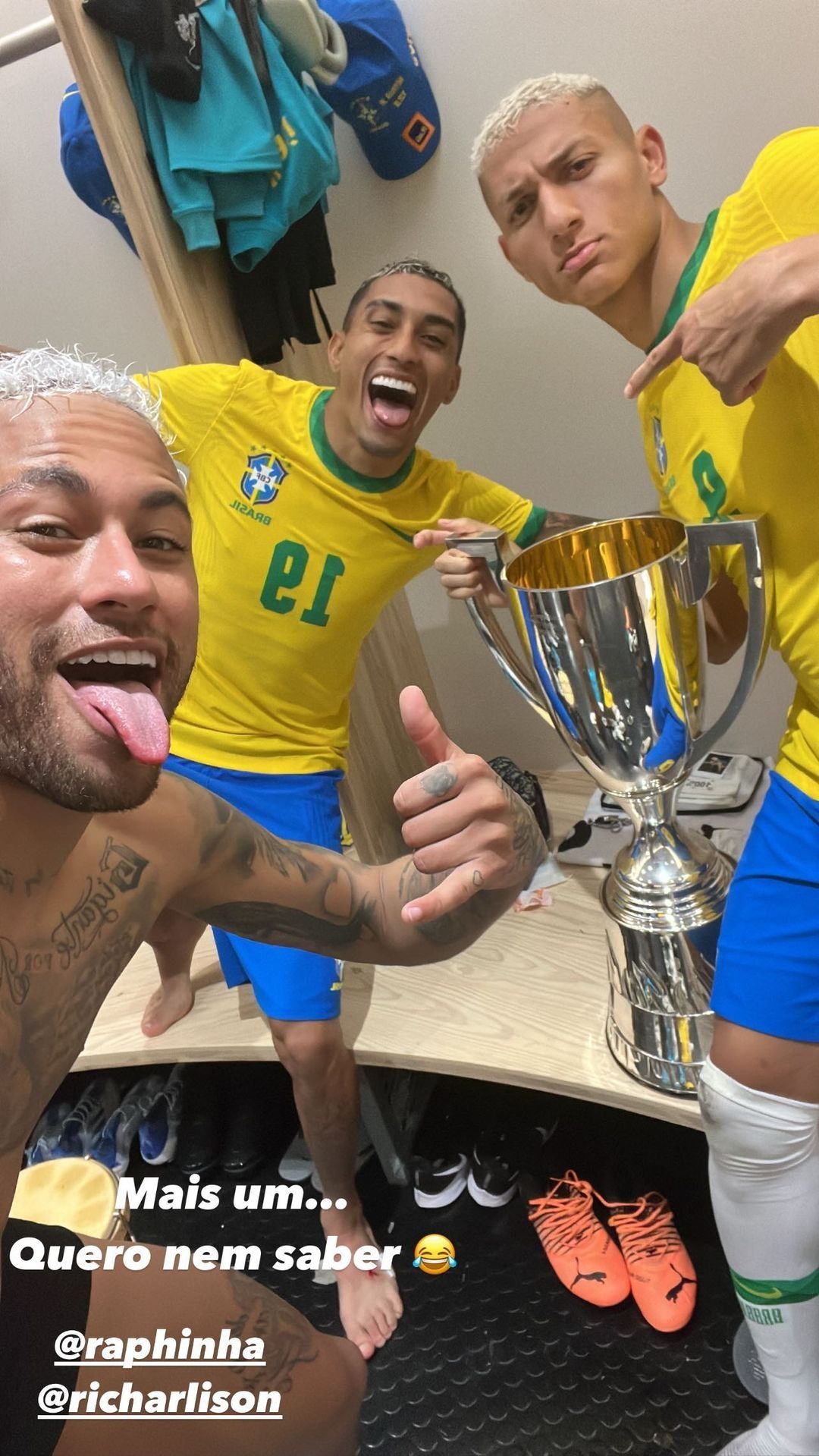 Ahora, el 10 subió una foto a su historia en la que se lo ve junto a Raphinha (actual jugador del Leeds de Inglaterra) y Richarlison (jugador del Everton, también de Inglaterra). En la misma, con un Trofeo en la mano, escribió: "Una más...No me interesa", junto al emoji de una carita riéndose.