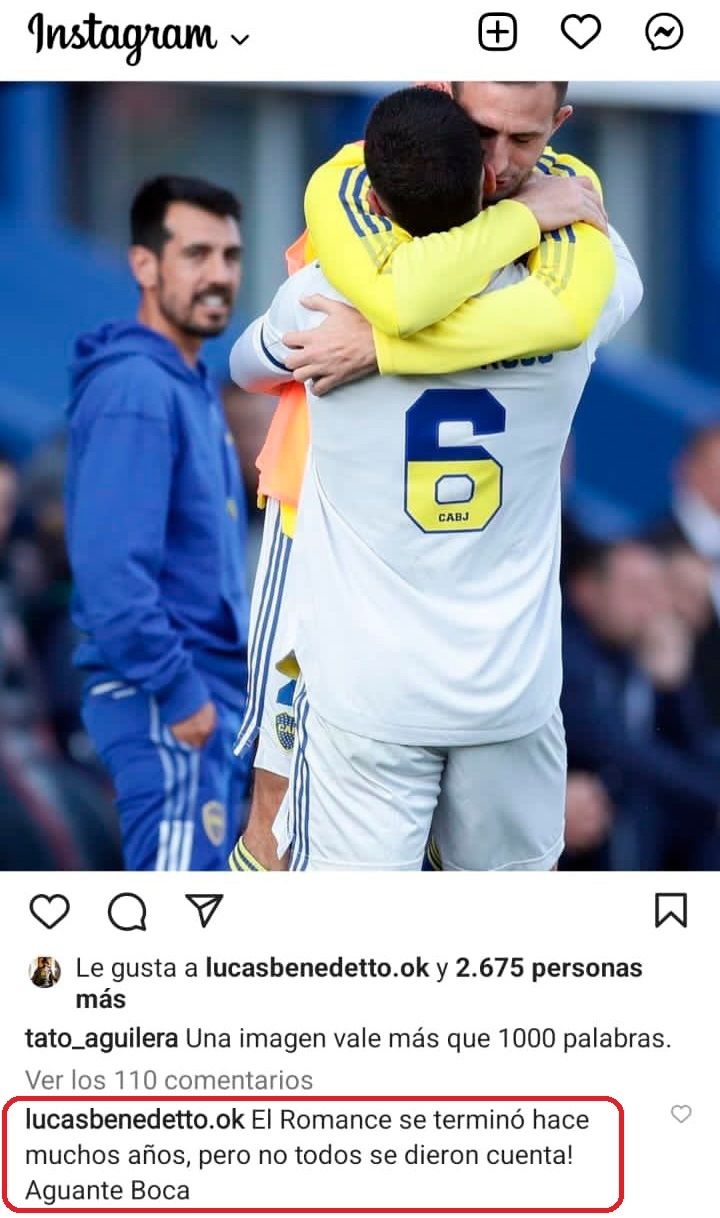 Una foto en Instagram del festejo de Marcos Rojo con Cali Izquierdoz en la cancha de San Lorenzo motivó a Lucas Benedetto, hermano del Pipa, a comentarla con un mensaje que le echó más nafta al fuego de la crisis que vive Boca. El posteo, publicado Tato Aguilera, periodista de TyC Sports que cubre el día a día de Boca, decía "una imagen vale más que 1000 palabras". Y el hermano de Darío Benedetto le dio "me gusta" a la publicación y escribió, en tácita -pero clara- alusión a Juan Román Riquelme: "¡El Romance se terminó hace muchos años, pero no todos se dieron cuenta! Aguante Boca". Booom.