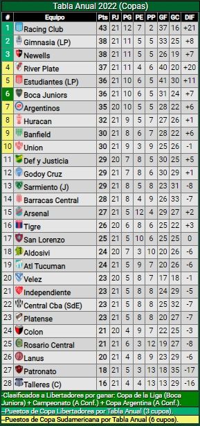 En este contexto, producto de dos triunfos, dos empates y tres derrotas en lo que va del certamen, en Núñez comienzan a preocuparse pensando en el ingreso a la Copa del 2023. Si el torneo terminara hoy, el Millonario se clasificaría a la fase previa de la Libertadores porque Newell's sería el campeón y liberaría un cupo de la tabla general. Pero si hoy el puntero no fuera ni Racing ni Gimnasia ni la Lepra, River estaría en zona de Copa Sudamericana. Para mayor preocupación, si Argentinos le gana este lunes a Tigre también lo pasaría en la tabla anual.