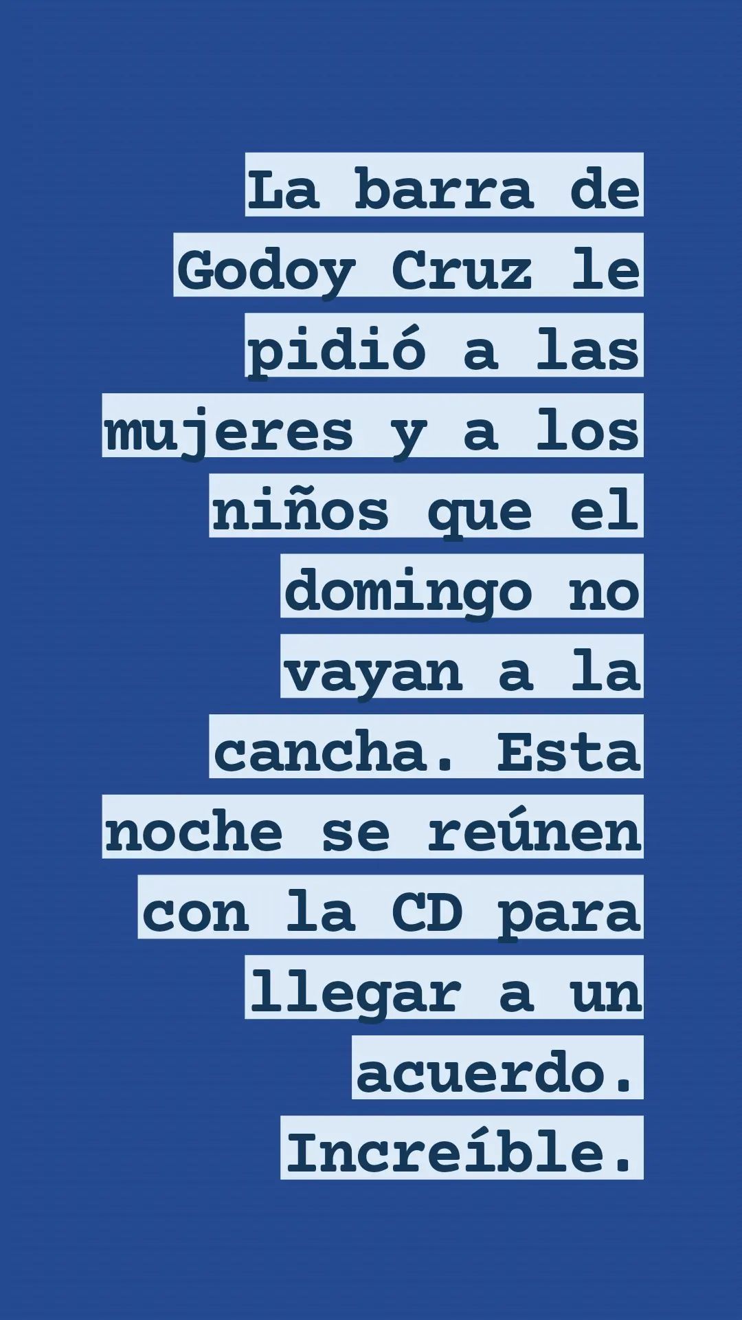 "El domingo la barra de Godoy Cruz va a querer suspender el partido con Lanús. Anoten", escribió en su primer. Además, horas más tarde, añadió: "La barra de Godoy Cruz le pidió a las mujeres y a los niños que el domingo no vayan a la cancha. Esta noche se reúnen con la CD para llegar a un acuerdo. Increíble".