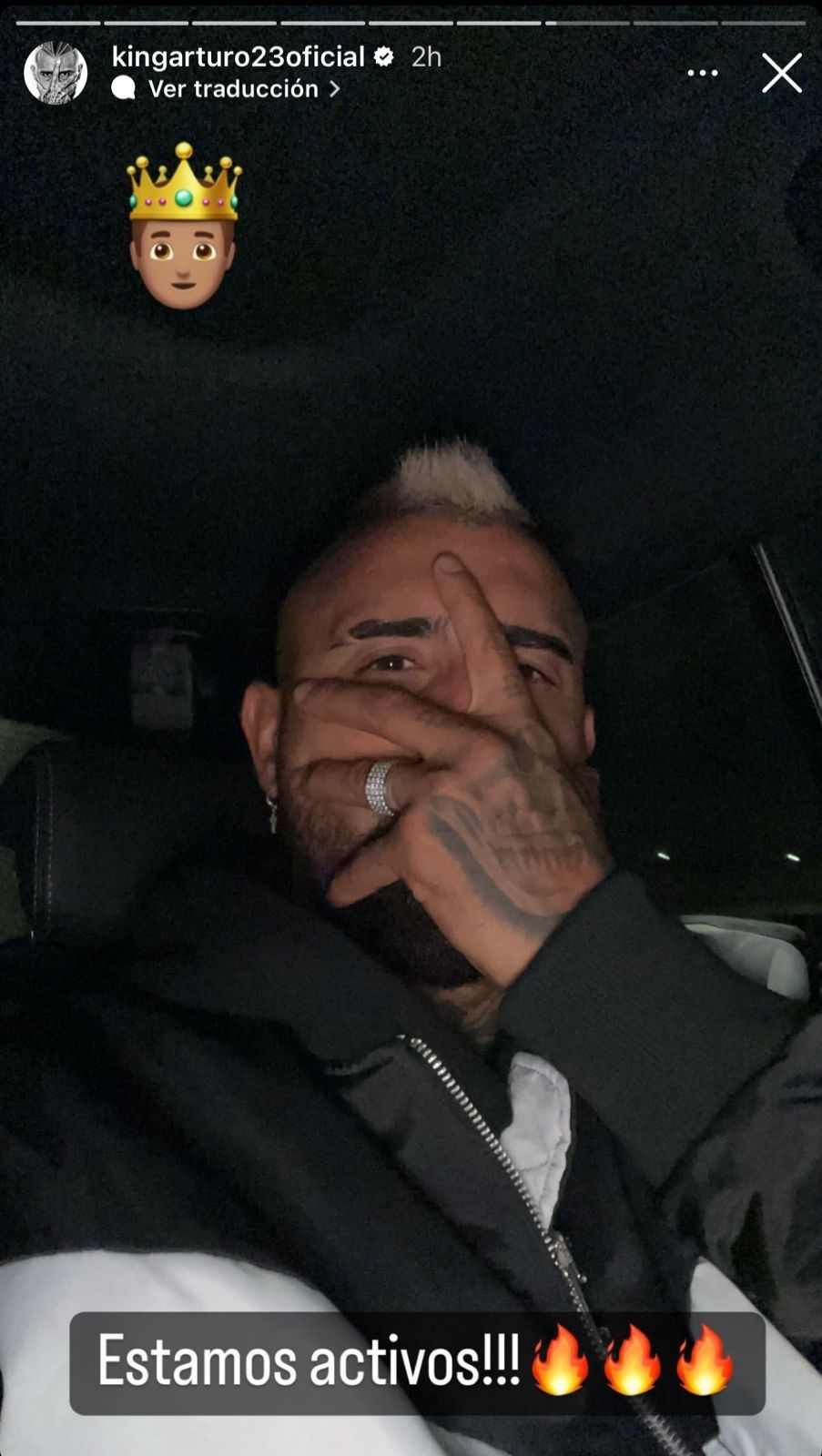 Tres fueron las fotos que Vidal subió a las historias de su cuenta de Instagram. La primera, una selfie tapándose la mitad del rostro y mostrando el tatuaje que tiene en una de sus manos. "Estamos activos", escribió el futbolista junto al emoji de tres llamas de fuego y un avatar suyo con una corona.