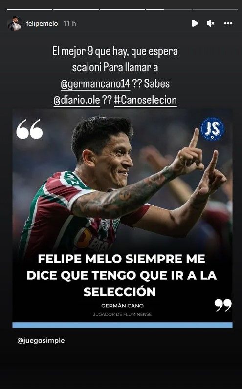 En una historia de Instagram, Felipe Melo elogió a Cano, quien hoy es el máximo goleador a nivel mundial en el año con 30 goles, y dejó un mensaje para Scaloni: "El mejor 9 que hay. Qué espera Scaloni para llamar a @GermanCano14???". El mediocampista etiquetó también al diario deportivo Olé para mover su pedido por Argentina.