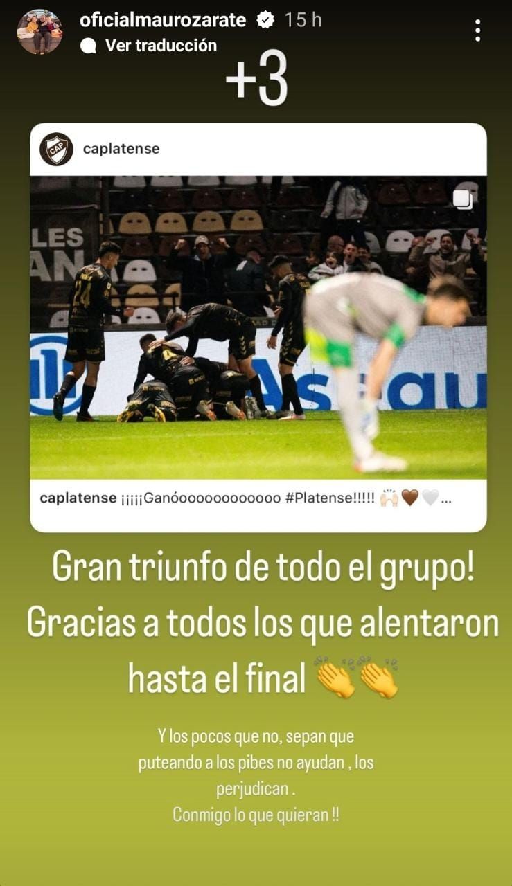 Post partido, Zárate publicó una historia de Instagram al respecto de la situación. Y lo hizo con un mensaje desafiante: "Gran triunfo de todo el grupo. Gracias a los que alentaron hasta el final. Y a los pocos que no, sepan que puteando a los pibes no ayudan, los perjudican. Conmigo lo que quieran".