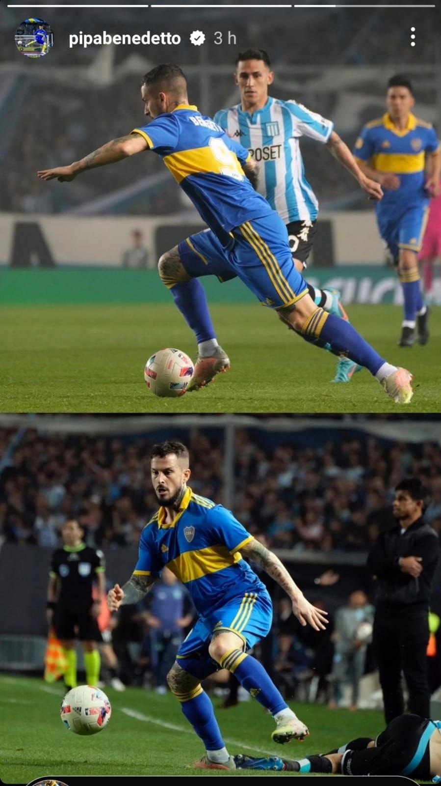 Con los humos más bajos, Benedetto subió varias fotos a sus historias cerca de las 2 de la mañana. Lejos de referirse a la pelea o al partido, el Pipa posteó imágenes suyas en un clásico ante Racing olvidable en varios aspectos para el delantero.