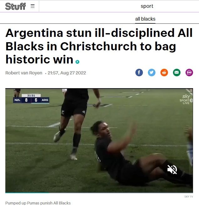 Stuff, diario del país maorí, escribió: "Argentina aturdió a unos All Blacks indisciplinados y se lleva una victoria histórica". Además, el periódico neozelandés añadió que el partido que los All Blacks perdieron con Sudáfrica hace 15 días fue el comienzo del cambio para el equipo negro.