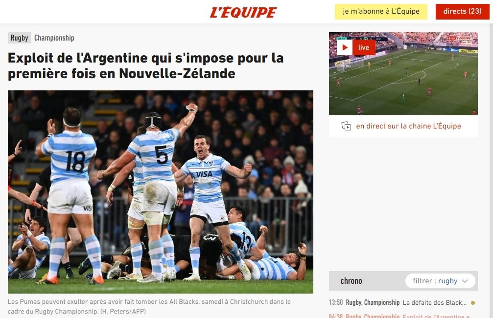 La de esta madrugada ante los All Blacks, no fue una simple victoria más para la Selección argentina de Rugby. Los Pumas vencieron por segunda vez al elenco neozelandés y, por primera vez en la historia, lo hicieron en su propia casa. El resultado fue 25-18 con una gran base en la excelente actuación defensiva del equipo argentino. Teniendo en cuenta la magnitud de lo conseguido este sábado en el Orangetheory Stadium de la ciudad de Christchurch, la prensa mundial se rindió a los pies de los comandados por Michael Cheika.