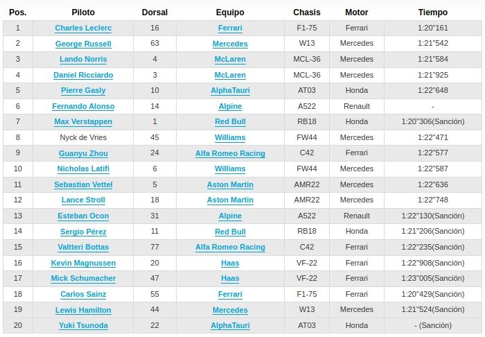 George Russell quedó sexto y compartirá la primera fila de la competencia con Leclerc. Tras los Ferrari, Red Bull y Mercedes, aparecen los McLaren, que ocuparán la segunda fila con Lando Norris (7mo) y el ganador del Gran Premio de Italia del año pasado, Daniel Ricciardo (8vo). Pierre Gasly estará con su AlphaTauri en la quinta posición mientras que Fernando Alonso arrancará sexto a pesar de no haber rodado en la Q3.