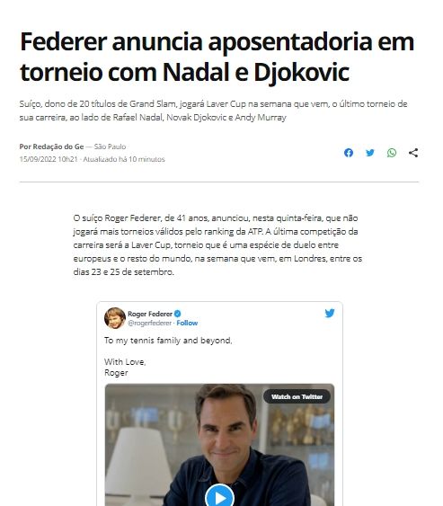 El diario Globo, de Brasil, también publicó la noticia: "Federer anuncia su retiro en un torneo con Nadal y Djokovic". También, escribió: "El suizo, dueño de 20 títulos de Grand Slam, jugará la Laver Cup la próxima semana, el último torneo de su carrera, junto a Rafael Nadal, Novak Djokovic y Andy Murray"