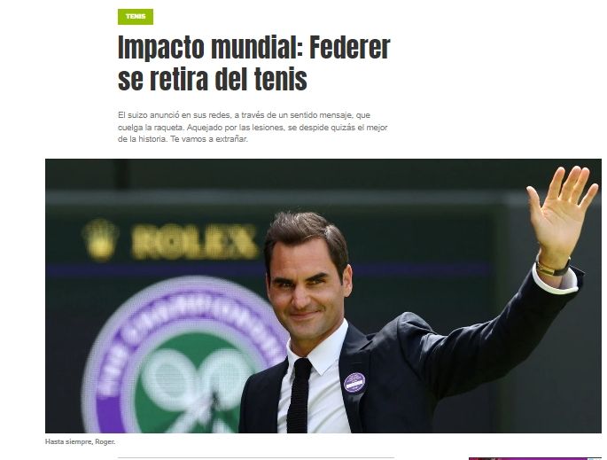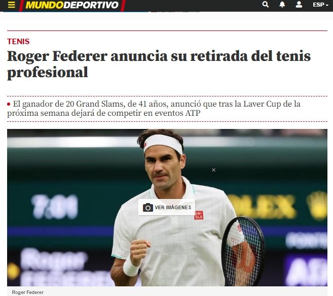 Mundo Deportivo, medio español, escribió: "Roger Federer anuncia su retirada del tenis profesional". También, en su bajada, añadió: "El ganador de 20 Grand Slams, de 41 años, anunció que tras la Laver Cup de la próxima semana dejará de competir en eventos ATP".