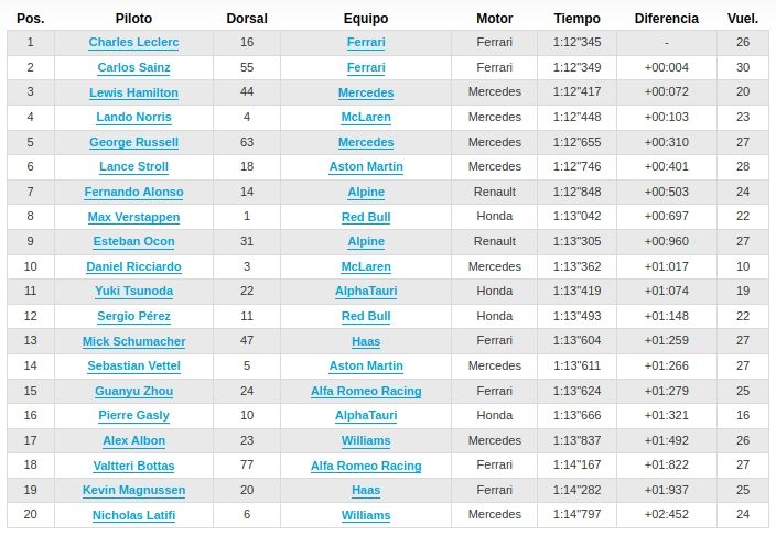 En el segundo, Max dedicó parte de la sesión para modificar reglajes y no terminó de sentirse cómodo. En esa tanda, Ferrari tomó el mando con Leclerc superando a Sainz al frente de la clasificación (1:12.345) y los dos autos del cavallino separados por solo cuatro milésimas. Hamilton quedó por delante de Lando Norris (McLaren) y su compañero George Russell.