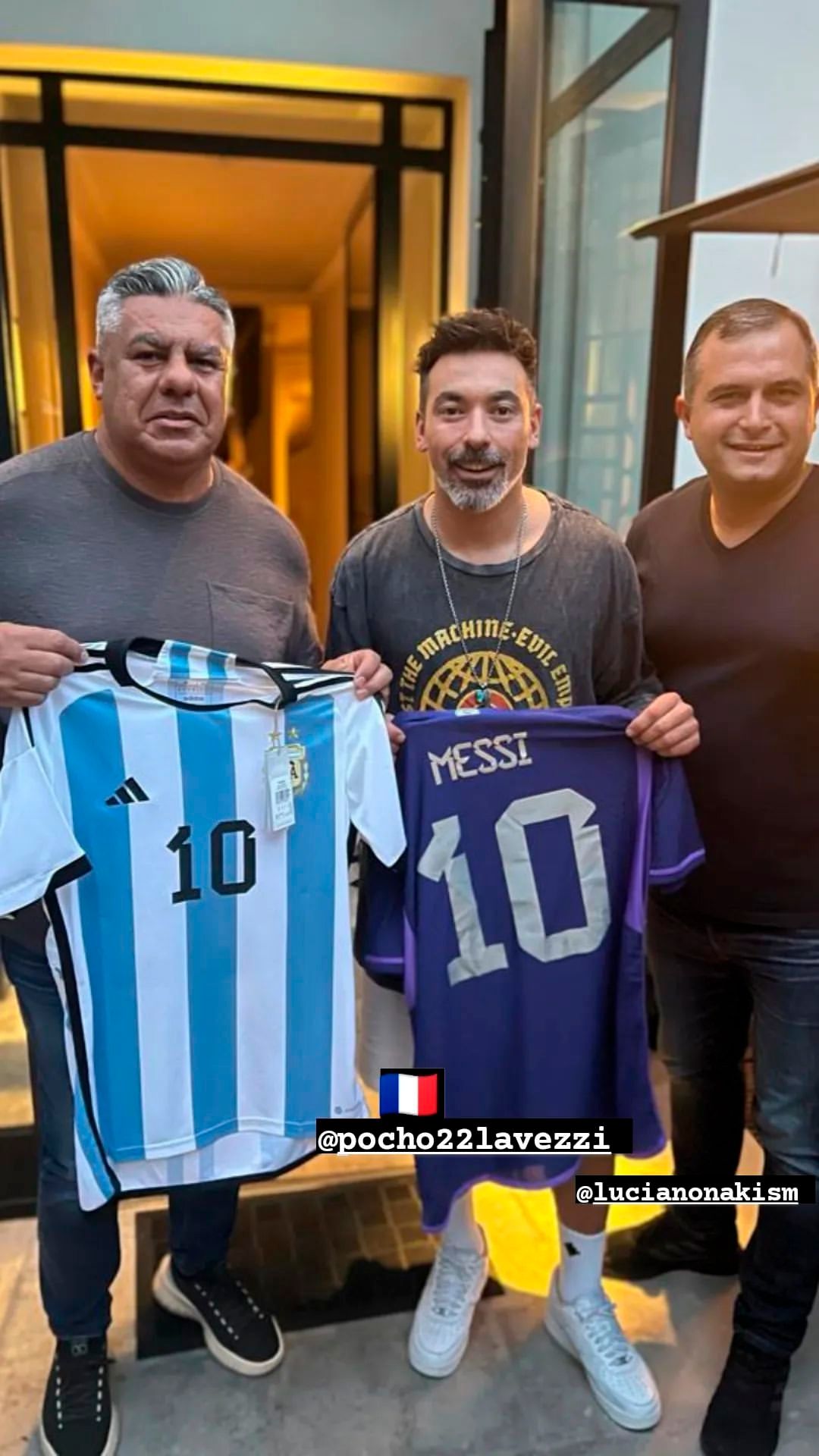 Más tarde, el dirigente publicó una foto más junto a Lavezzi, quien fue subcampeón del mundo en Brasil 2014 con el equipo argentino, mostrando las camisetas que la Selección usará en Qatar. Allí también estuvo el prosecretario de la AFA Luciano Nakis, quien además es presidente de Deportivo Armenio.