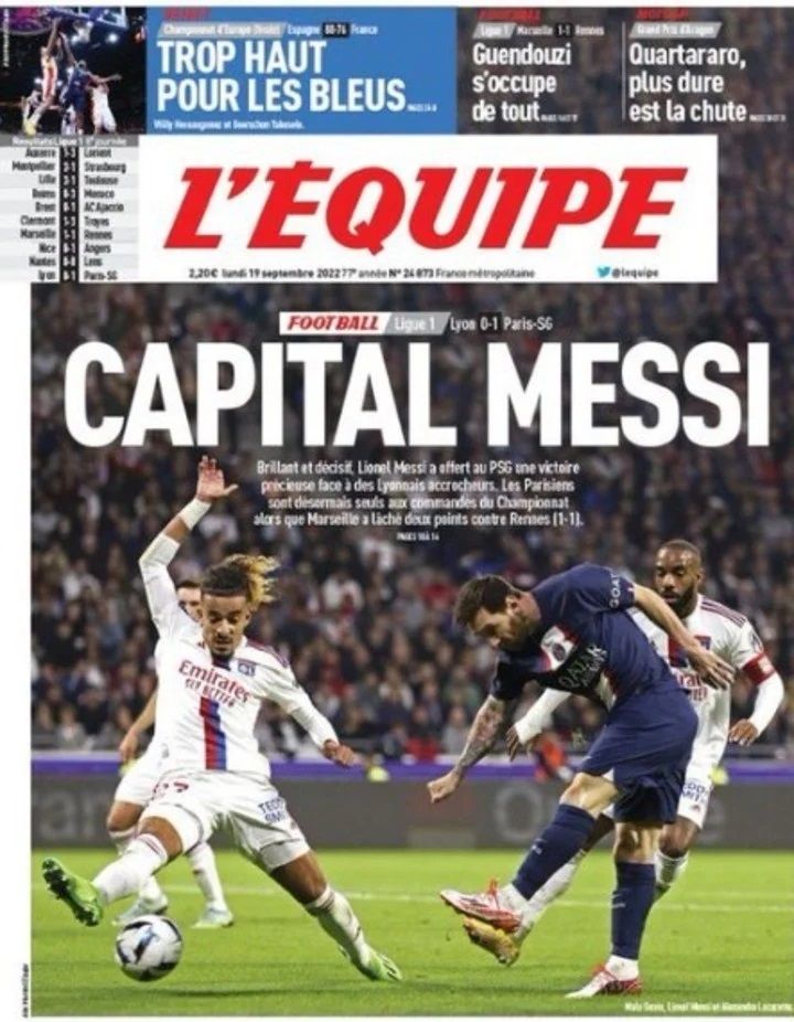 "Capital Messi", se leyó en el título, con una foto del argentino en acción. "Brillante y decisivo. Lionel Messi ofreció al PSG una preciosa victoria ante el Lyon. Los parisinos ahora están solos al mando del campeonato, porque Marsella perdió dos puntos contra Rennes", completó la tapa del citado medio que además lo colocó en su equipo ideal de la fecha.