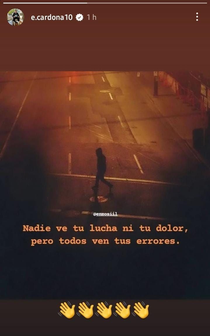 "Nadie ve tu lucha ni tu dolor, pero todos ven tus errores", reza la frase que acompaña la imagen de un hombre encapuchado cruzando la calle. No obstante, lo más llamativo son los emojis que usó Cardona: puso varias manitos que saludan... ¿en alusión a una despedida de Racing?