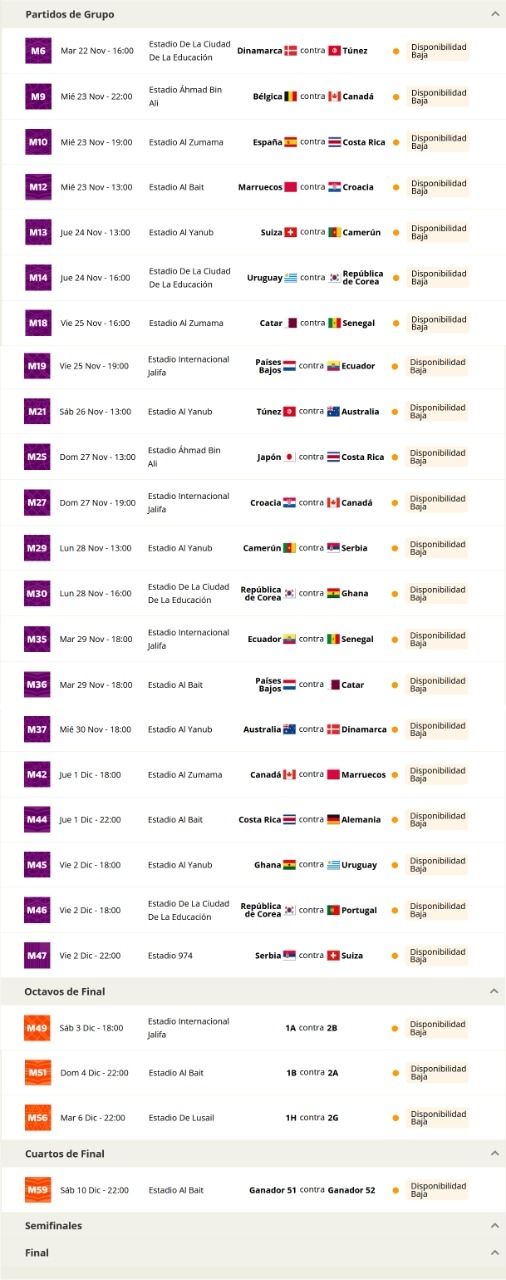 A esta altura, como era de esperarse, el stock se va agotando y cada vez son menos los partidos que cuentan con entradas disponibles. De los 64 encuentros con los que contará Qatar 2022, en tan solo 25 podemos encontrar disponibilidad. Para la Selección argentina y sus posibles destinos en play off ya se encuentra agotadas.