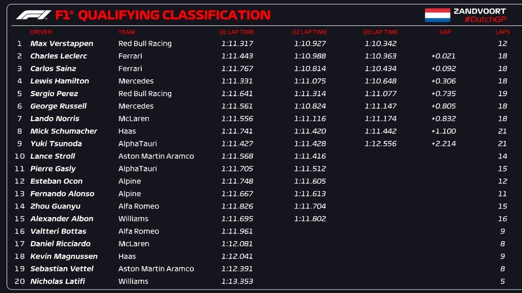 Checo Pérez saldrá quinto a pesar de su accidente en Zandvoort, por delante del Mercedes del británico George Russell. Lando Norris y su McLaren partirán desde la séptima posición, el alemán Mick Schumacher (Haas) fue octavo y el japonés Yuki Tsunoda (Alpha Tauri). Lance Stroll (Aston Martin), que optó por reservar neumáticos y no salió a pista en la Q3, completaron el top 10.
