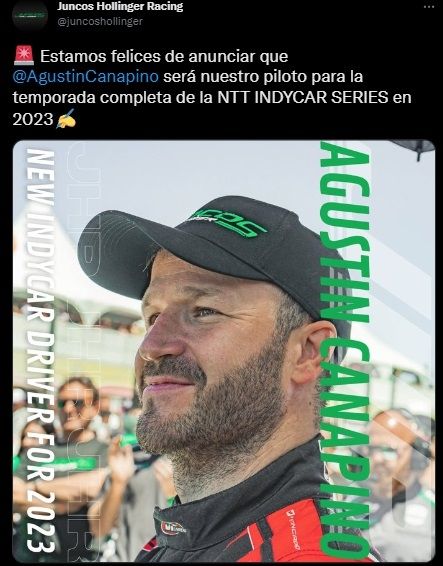 Una verdadera bomba sacude el automovilismo argentino. Agustín Canapino, múltiple campeón del automovilismo local, fue anunciado como piloto oficial del Juncos Hollinger Racing para toda la temporada del IndyCar, máxima división del deporte motor en los Estados Unidos.