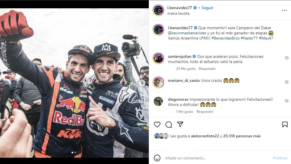 Además, en su cuenta de Instagram, realizó un posteo donde aparece con un emocionado Kevin y escribió: "Que momento!! Campeon del Dakar @kevinmaxbenavides y yo fui el más ganador de etapas. Vamos Argentina LPM!!!". La publicación, en pocos minutos superó los 20 mil me gusta y durante la jornada ese número seguramente crecerá.